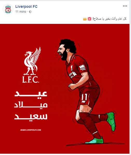 هنأ نادي ليفربول البريطاني نجمه ونجم المنتخب الوطني محمد صلاح بمناسبة عيد ميلاده 26، حيث ولد اللاعب في مثل هذا اليوم 15 يونيو في عام 1992 بالغربية، وقال النادي عبر صفحته الرسمية بموقع فيس بوك: كل عام وأنت بخير يا صلاح.