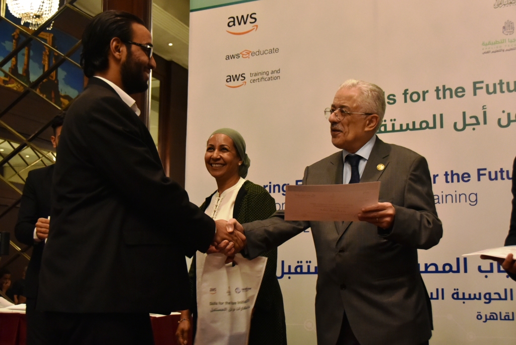 تنظم الان وزارة التربية والتعليم والتعليم الفنى بالتعاون مع البنك الدولى، وشركة أمازون ويب ، احتفالية لتوزيع الجوائز والشهادات على طلاب التعليم الفنى الذين خضعوا للبرنامج التدريبي؛ لإعداد طلاب التعليم الفنى للمنافسة فى الاقتصاد العالمى، ضمن مبادرة "مهارات من أجل المستقبل" وأنشطة مبادرة "صناع مصر"