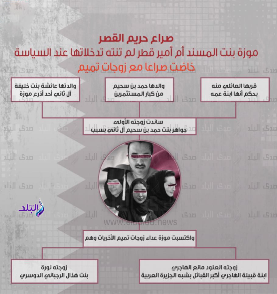 أشار الإنفوجراف إلى تفضيل موزة بنت المسند، لزوجته الأولى جواهر بنت حمد بن سحيم آل ثاني، بسبب قربها العائلي منه بحكم أنها ابنة عمه، ولأن والدها من كبار المستثمرين في قطر، كذلك لأن والدتها عائشة بنت خليفة آل ثاني أحد أذرع موزة، ما تسبب في عداء بين أم أمير قطر، وزوجته الثانية العنود مانع الهاجري، ابنة قبيلة الهاجري أكبر القبائل بشبه الجزيرة العربية، والثالثة نورة بنت هذال الرجباني الدوسري.