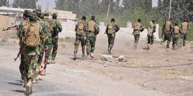 وذكرت وكالة الأنباء السورية اليوم /الإثنين/ بأن رمايات مدفعية دقيقة لوحدة من الجيش دكت أوكارا ونقاط تسلل مجموعات إرهابية في قرية نبع الصخر بالقرب من الحدود الإدارية لريف درعا الشمالي الغربي ومحيط مدينة القنيطرة، ما أسفر عن إيقاع عدد من أفرادها قتلى ومصابين وتدمير تحصينات وأوكار لهم، مشيرة إلى أن تحركات الإرهابيين تتم تحت حماية كيان العدو الإسرائيلي وبالتنسيق مع متزعمي التنظيمات الإرهابية في المنطقة.