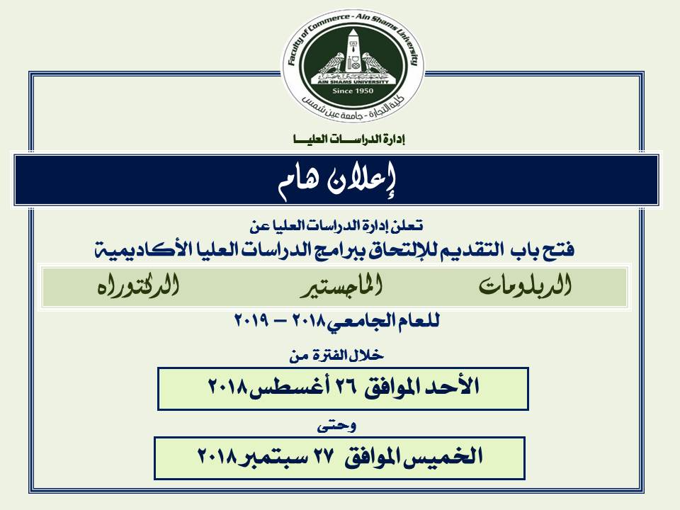 أعلنت الدكتور هيام وهبه وكيل كلية التجارة بجامعة عين شمسعن فتح باب التقدم للإلتحاق ببرامج الدراسات العليا الاكاديمية للدبلومات والماجستير و الدكتوراة للعام الدراسي الجديد 2018 -2019.