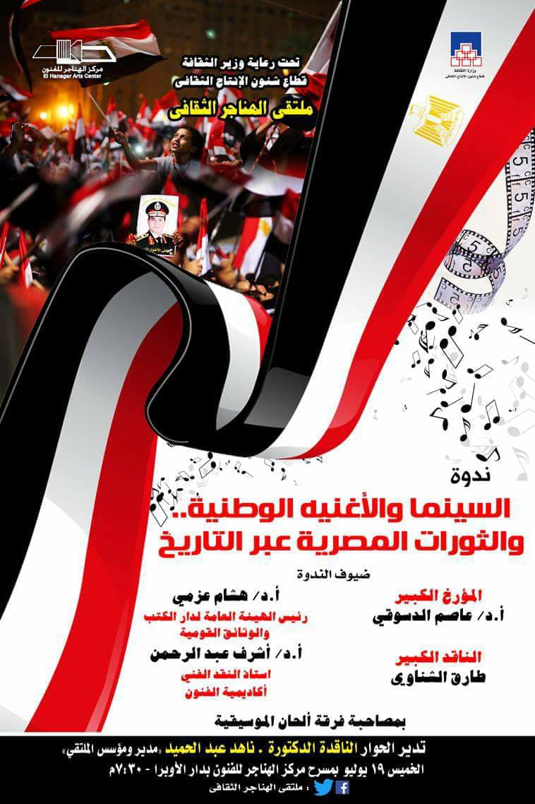 ينظم قطاع شؤون الإنتاج الثقافى برئاسة المخرج خالد جلال، ملتقى الهناجر الثقافى تحت عنوان " السينما والأغنية الوطنية .. والثورات المصرية عبر التاريخ"، وذلك يوم الخميس 19 يوليو الجارى، فى السابعة والنصف مساء، بمركز الهناجر للفنون بساحة دار الاوبرا المصرية.