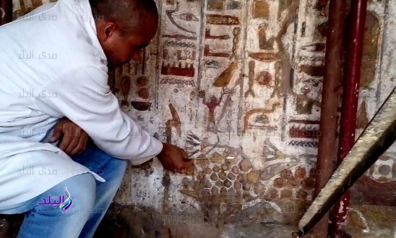 وأشار إلى أن فريق الترميم استطاع ازالة ما خلفته العوامل الطبيعية من اثار سلبية على مر السنين مثل الأتربة و السناج ومخلفات الطيور والخفافيش، مما اظهر العديد من النقوش الجدارية الملو لأول مرة وخاصةً تلك النقوش التى تصور الملك امنحتب الثالث في علاقاته مع الآلهة والآلهات المختلفة.