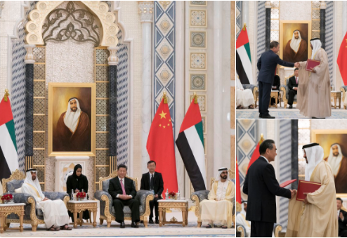 نشر محمد بن زايد ولي عهد أبو ظبي ونائب القائد الأعلى للقوات المسلحة صورة تجمعة مع الشيخ محمد بن راشد، نائب رئيس دولة الإمارات رئيس مجلس الوزراء حاكم دبي ورئيس الصين شي جين بينغ لتوقيع مراسم تبادل 13 اتفاقية ومذكرة تفاهم بين البلدين.