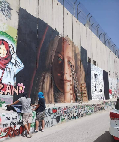 رسم فنان الجرافيتي الإيطالي جوريت آجوش، لوحة لعهد التميمى على الجدار الإسرائيلي العازل في بيت لحم بالضفة الغربية، والتي من المتوقع أن يطلق سراحها يوم الأحد المقبل.