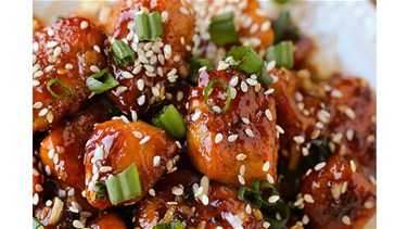 ثمّ ضعوا الدجاج مع المزيج وقدموه بعد تزيينه بالبصل المفروم والسمسم.