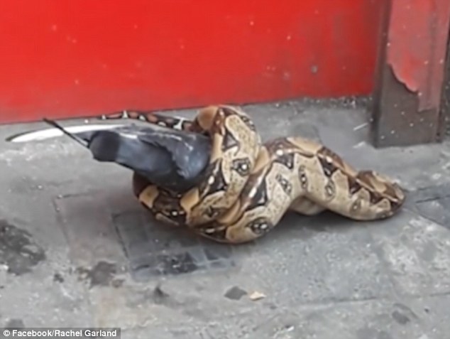 وتوضح لقطات نشرتها صحيفة "ديلي ميل"، ثعبانا عملاقا يعتصر حمامة ويبتلعها في شارع ليتونستون المزدحم.