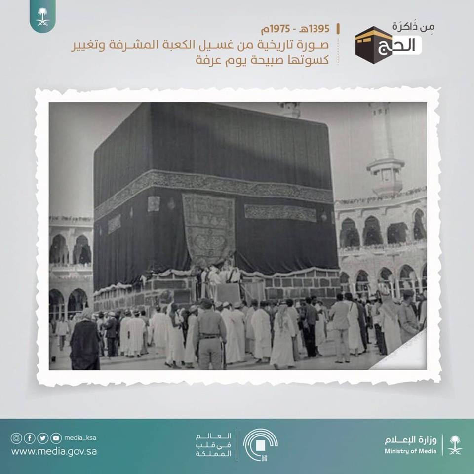 وجاء بالتغريدة "من ذاكرة الحج | صورة تاريخية من غسيل الكعبة المشرفة وتغيير كسوتها صبيحة يوم عرفة من عام 1395هـ - 1975م"