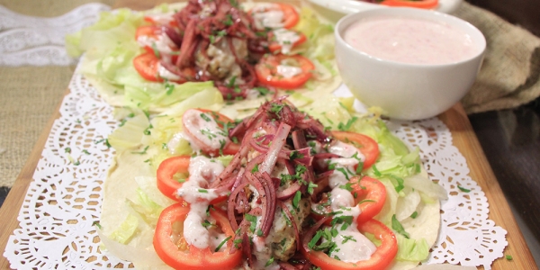 * تقدم على عيش تورتيلا مع البصل بالسماق وصوص الزبادي وشرائح الخيار والطماطم والخس والبقدونس