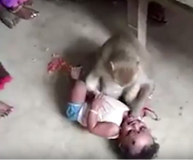 أظهرت لقطات مرعبة لقرد متهور يتشبث برضيع على الأرض، ويهاجم أي قروي يحاول الاقتراب منه بأحد المناطق في الهند .