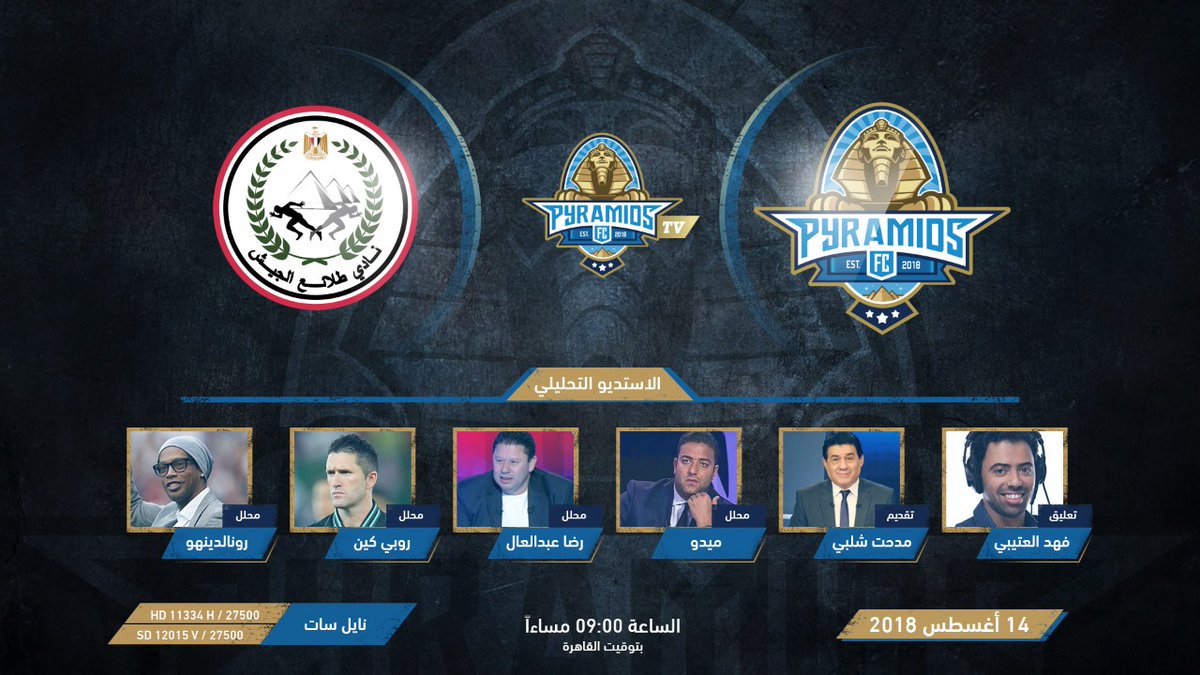 أعلنت قناة نادي بيراميدز المصرية ظهور رونالدينيو نجم برشلونة الإسباني سابقًا، وروبي كين، نجم ليفربول الإنجليزي سابقًا، عبر شاشتها لتحليل مباراة طلائع الجيش وبيراميدز اليوم في الدوري المصري.