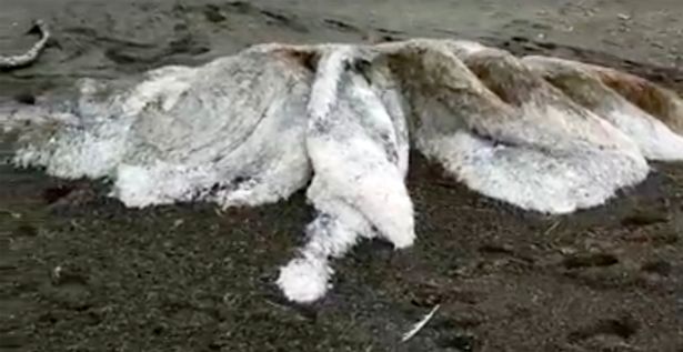 وجد السكان المحليون المخلوق الغريب المشتبه فى كونه حوتا نافقا، ولكنهم كانوا و مازالوا فى حيرة تمامًا حتى الآن، ويعادل حجمه حجم ثلاثة رجال بالغين وله رأس وعينان محددتان، وتكهن بعضهم أن المخلوق بقايا بدائية غريبة من الماموث الصوفي المنقرض.