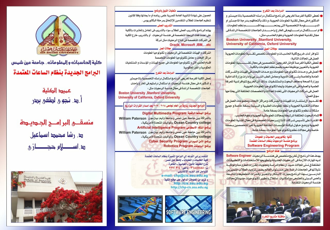 أعلنت كلية الحاسبات والمعلومات جامعة عين شمس، عن فتح باب التقدم لثلاثة برامج جديدة بمصاريف بنظام الساعات المعتمدة للعام الجامعي ٢٠١٨-٢٠١٩ وهي: