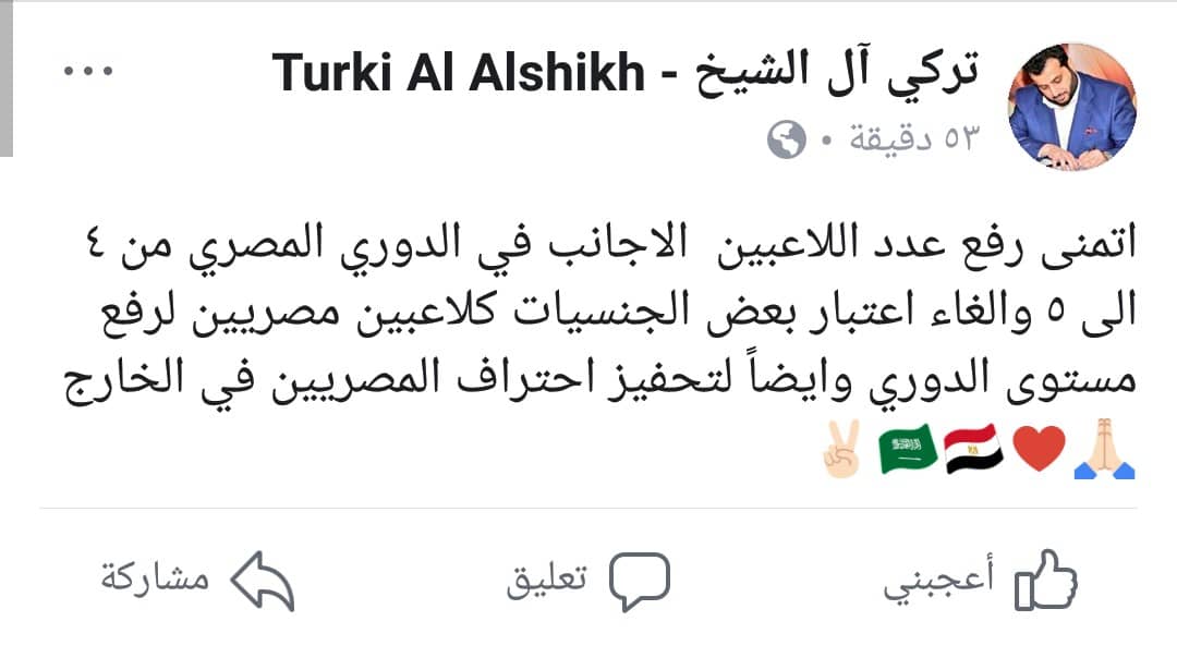 وكتب «تركي»، عبر صفحته الرسمية على موقع «فيس بوك» قائلًا: «أتمنى رفع عدد اللاعبين الأجانب في الدوري المصري من ٤ إلى ٥ لاعبين».