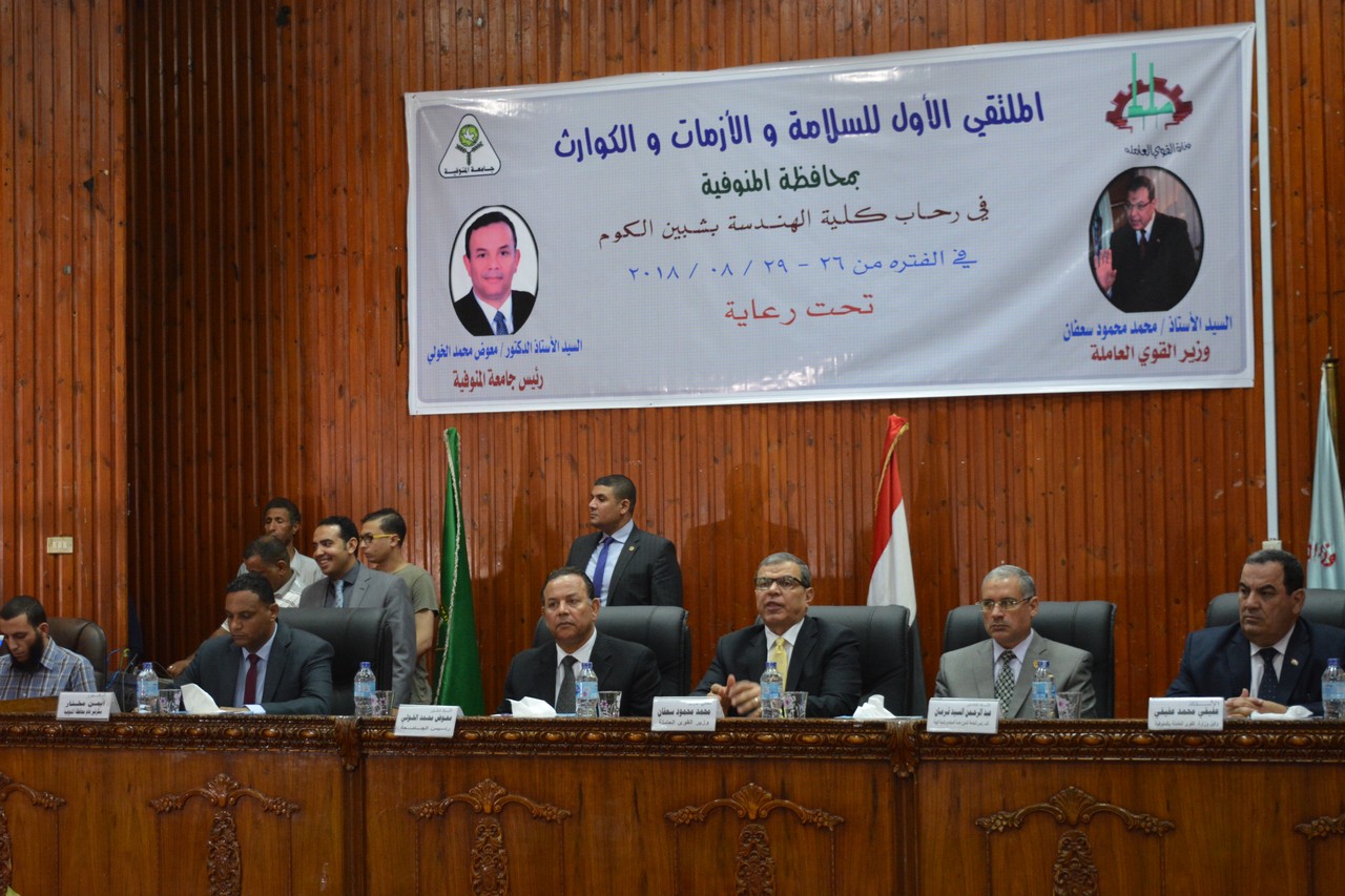 افتتح وزير القوى العاملة محمد سعفان اليوم، الأحد، الملتقى الأول للسلامة والأزمات والكوارث، بقاعة الاحتفالات الكبرى في كلية الهندسة بجامعة المنوفية، لزيادة التوعية فى مجال السلامة والصحة المهنية لجميع الجهات الحكومية، وغير الحكومية.
