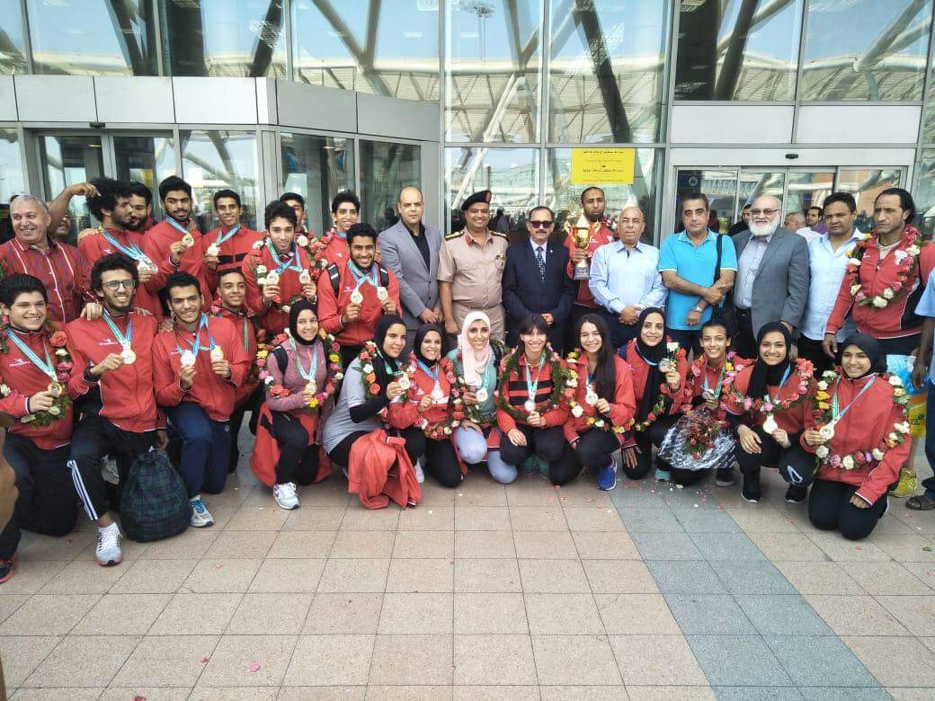 وأشاد الوزير بمستوي جميع اللاعبين واللاعبات والأجهزة الفنية والإداريةوسياسة مجلس الإدارةالتي أدتإلىارتفاع المستوىالفني لجميع المنتخبات، واوفد وزير الرياضة علاء فهمي مدير عام الهيئات بالوزارة لاستقبال البعثة التي وصلت مطار القاهرة صباح اليوم .