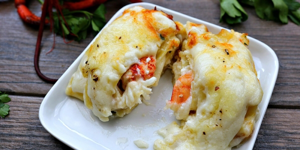 - تكرر الخطوات حتى نفاذ كمية شرائح المكرونة والسي فوود ثم تغطى بطبقة من البشاميل ويضاف الجبنة على الوجه وتقدم