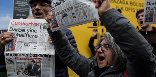 وقالت المجلة إن صحيفة "جمهوريت" التركية اليومية، وضعت الأسبوع الماضي، تحت إدارة جديدة في خطوة وصفتها مقررة الملف التركي بالبرلمان الأوروبي كاتي بيري بـ "الضربة القاضية لما تبقى من حرية الصحافة في تركيا، واستقال عدد من الصحفيين، بينما تم فصل آخرين منها".