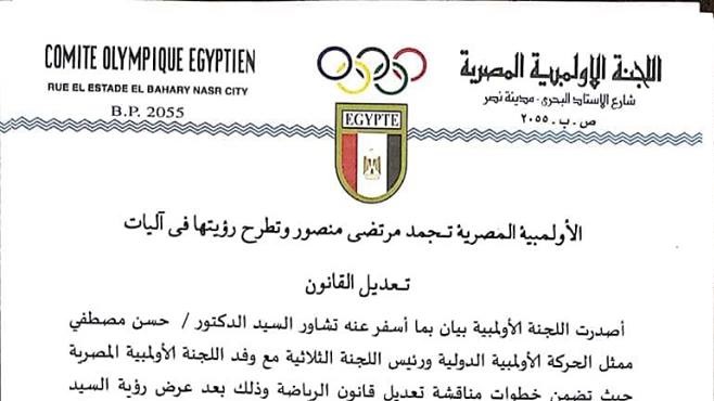 أصدرت اللجنة الأولمبية المصرية فى اجتماعها اليوم بيانا بما أسفر عنه تشاور الدكتور حسن مصطفي ممثل الحركة الأولمبية الدولية رئيس اللجنة الثلاثية مع وفد اللجنة الأولمبية المصرية حيث تضمن خطوات مناقشة تـعديل قانون الرياضة وذلك بعد عرض رؤية وزير الرياضة علي لجنة مشتركة من اللجنة الأولمبية والوزارة ومن يري الوزير ضمه للجنة برئاسة رئيس اللجنة الأولمبية.