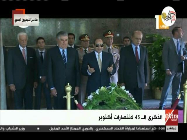 عرضت فضائية "اكسترا نيوز" لقطات مصورة للرئيس عبد الفتاح السيسى وهو يضع إكليلًا من الزهور على قبر الرئيس الراحل محمد أنور السادات.