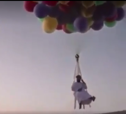 ويوضح الفيديو المتداول، أب مسن يجلس على كرسي مربوط بمئات البالونات وبجواره أبنائه الذين، تركوا والدهم يطير في الهواء في مزحة كادت تقضي على حياة والدهم، الذي عبر من الإمارات حتى سلطنة عمان من خلال الكرسي الطائر عبر البالونات المعلقة به.
