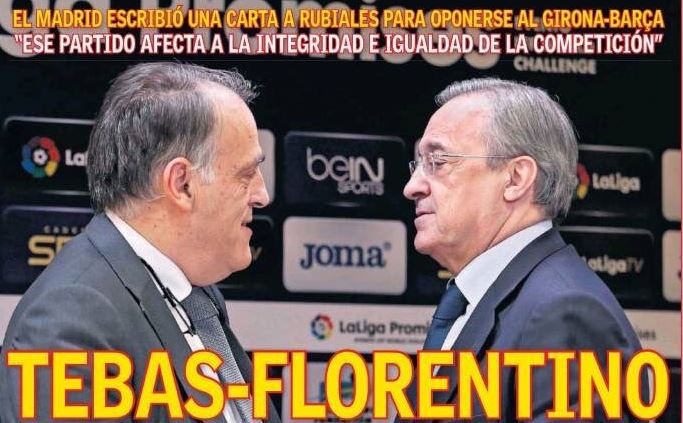 وعنونت صحيفة "آس" الإسبانية، عنوانًا: "المعركة بين رئيس رابطة الليجا تيباس وبيريز على إقامة مباريات الدوري الإسباني، في ولاية ميامي، بالولايات المتحدة الأمريكية".
