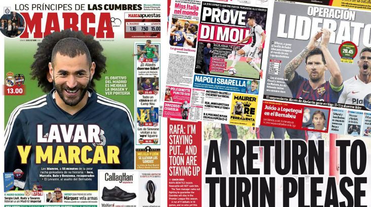 وقالت صحيفة "ماركا" المقربة من ريال مدريد على غلافها: "ينوي ريال مدريد أن يعود للتسجيل وإلى طريق الفوز مع عودة إيسكو، ومارسيلو، وبيل، وبنزيما لقائمة الفريق"، منوهة بأن الفريق على بعد 55 دقيقة، لتحقيق أسوأ سجل تهديفي في تاريخ النادي.