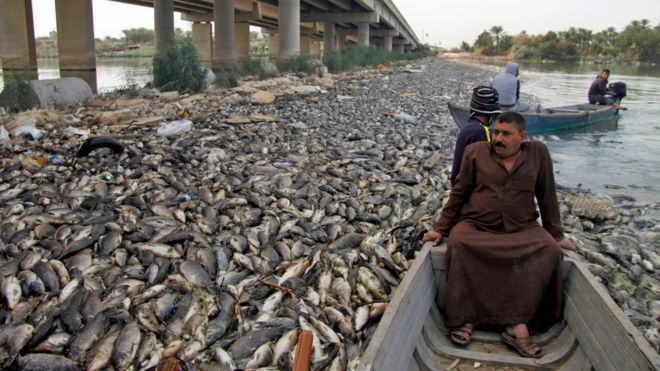 وأوضح التقرير أن السلطات العراقية حذرت من شراء وتناول الأسماك في الوقت الحالي، بينما كشفت وزارة الزراعة العراقية عن انخفاض منسوب المياه في نهري دجلة والفرات وارتفاع معدلات التلوث بهما، فيما صرحت وزارة الصحة والبيئة العراقية بأنها شكلت فريقا للتحقيق في ظاهرة نفوق الأسماك.