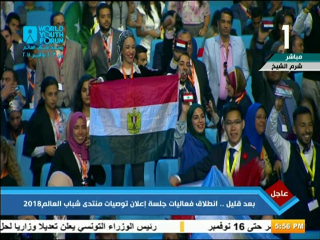 رفع الشباب المشارك فى فعاليات إعلان توصيات منتدى شباب العالم في نسخته الثانية المقام فى مدينة شرم الشيخ أعلام مصر دخل القاعة المخصصة لعقد الجلسة.