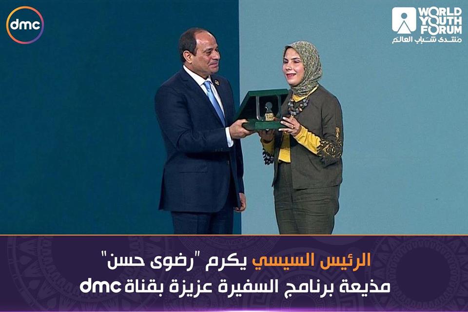 ومن النماذج التى كرمها الرئيس"رضوى حسن" مذيعة برنامج السفيرة عزيزة بقناة dmc التى حاربت الظروف واستطاعت تحقيق حلمها فى الإعلام رغم الإعاقة.