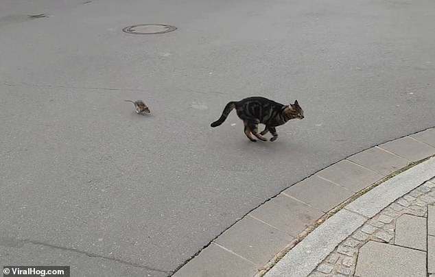 وبدت شجاعة الفأر النادرة فى مطاردته ومشاكسته للقطة، التى بذلت قصاري جهدها للهرب، بعدما أقنعها أنها الفريسة وليس العكس كالمعتاد.