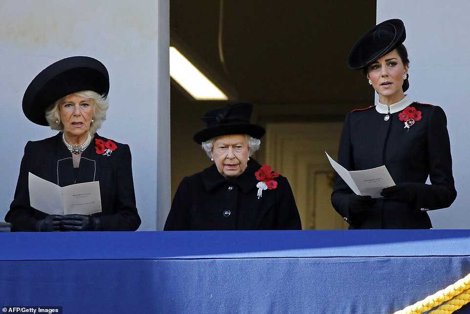 ووقفت الملكة إليزابيث برفقة كيت ميدلتون زوجة الأمير ويليام، ودوقة كورنوال كاميلا زوجة الأمير تشارلز، يشاهدن فعاليات إحياء الذكرى، أما ميجان ميركل فقد ظهرت من شرفة أخرى منفصلة.