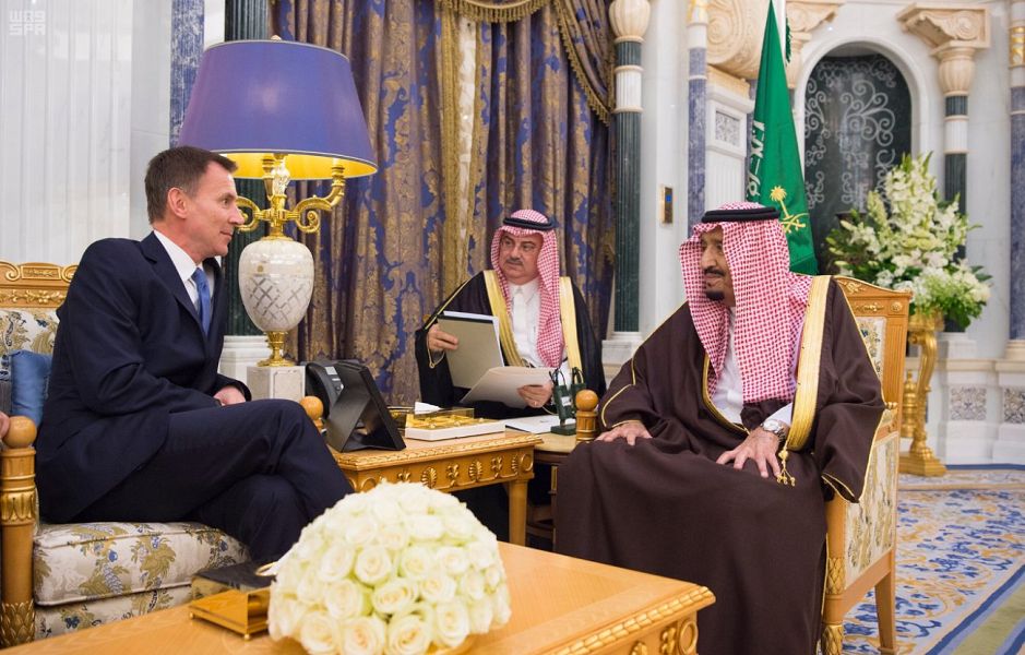 نشر الحساب الرسمى لوزارة الخارجية للمملكة العربية السعودية عبر حسابها الرسمى على موقع " تويتر" : " #الرياض | #الملك_سلمان يستقبل وزير خارجية #بريطانيا جيرمي هنت، وتم خلال الاستقبال استعراض العلاقات، ومجالات التعاون بين البلدين، بالإضافة إلى بحث مستجدات الأحداث في المنطقة".