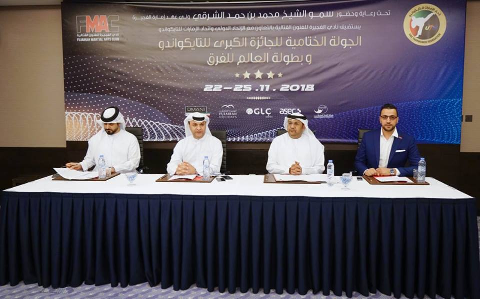 أقيم المؤتمر الصحفي لنهائي الجائزة الكبرى للتايكوندو G8 وبطولة العالم للفرق المقرر إقامتهما في الفترة من ٢٢ إلى ٢٥ نوفمبر الجاري في مجمع زايد الرياضي برعاية ودعم سمو الشيخ محمد بن حمد الشرقي ولي عهد الفجيرة و بتنظيم نادي الفجيرة للفنون القتالية تحت إشراف اتحاد الإمارات للتايكواندو.