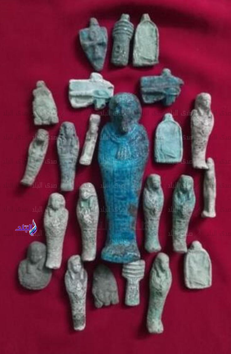 وأوضح أن تلك القطع عبارة عن تمثالين أوشابتي صغيرين يمثلان المعبود أنوبيس، وتمثال آخر أوشابتي، وعدد من التماثيل الصغير المصنوعة من الفيانس تمثل بعضها الرموز الفرعونية مثل عين حورس.