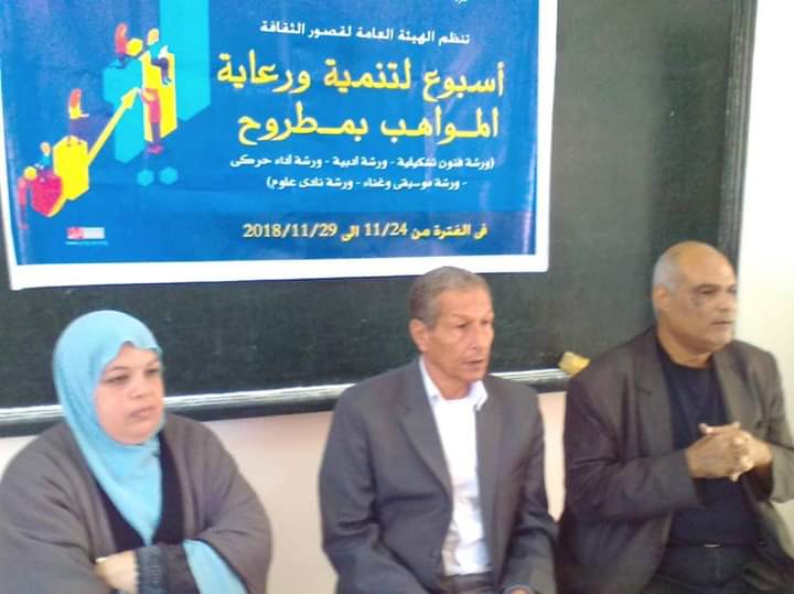 نظمت الهيئة العامة لقصور الثقافة مجموعة من الفعاليات الثقافية والفنية بفرع ثقافة مطروح بالتعاون مع الإدارة العامة للمواهب،أسبوع ثقافى فنى لتنمية الموهوبين والذي يستمر حتى 29نوفمبر الجارى.