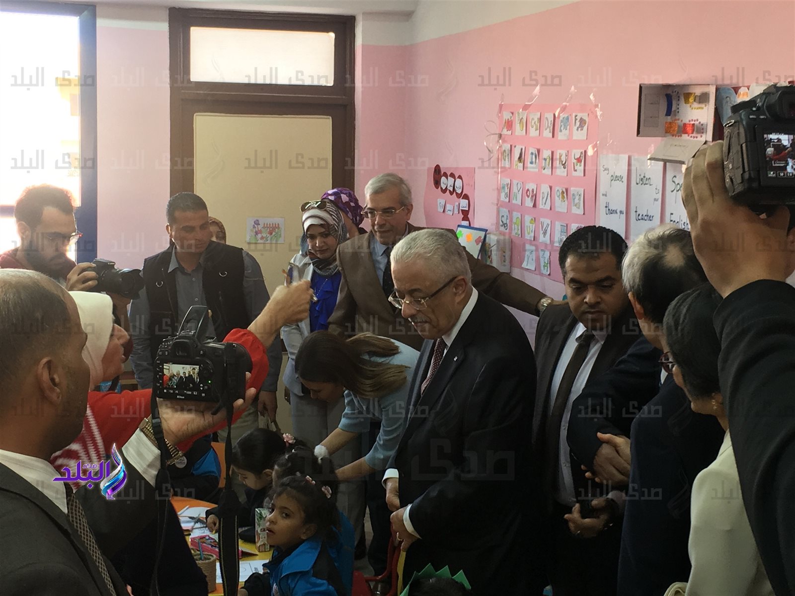 وقد استقبل الوزيران تلاميذ رياض الاطفال بالمدرسة ، الذين وقفوا في صفين في مدخل المدرسة حاملين العلمين المصري و الياباني