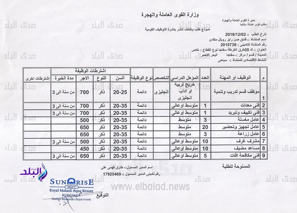 أعلنت مديرية القوى العاملة بالبحر الأحمر،عن توافر ١٤٠ فرصة عمل، بالمنشآت السياحية والفنادق والقرى السياحية داخل مدن المحافظة، وذلك برواتب تتراوح ما بين 450 و4500 جنيه.