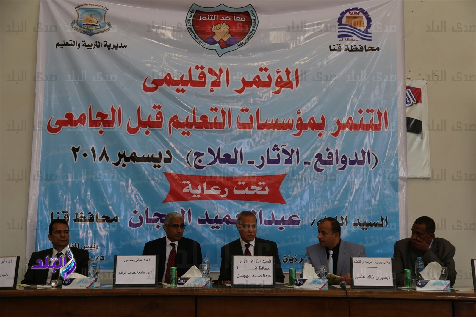 شارك اللواء عبد الحميد الهجان محافظ قنا، والدكتور عباس منصور رئيس جامعة جنوب الوادي، في فعاليات المؤتمر الإقليمي لمناهضة التنمر بمؤسسات التعليم قبل الجامعي "الدوافع– الآثار– العلاج" الذي نظمته مديرية التربية والتعليم بقنا.