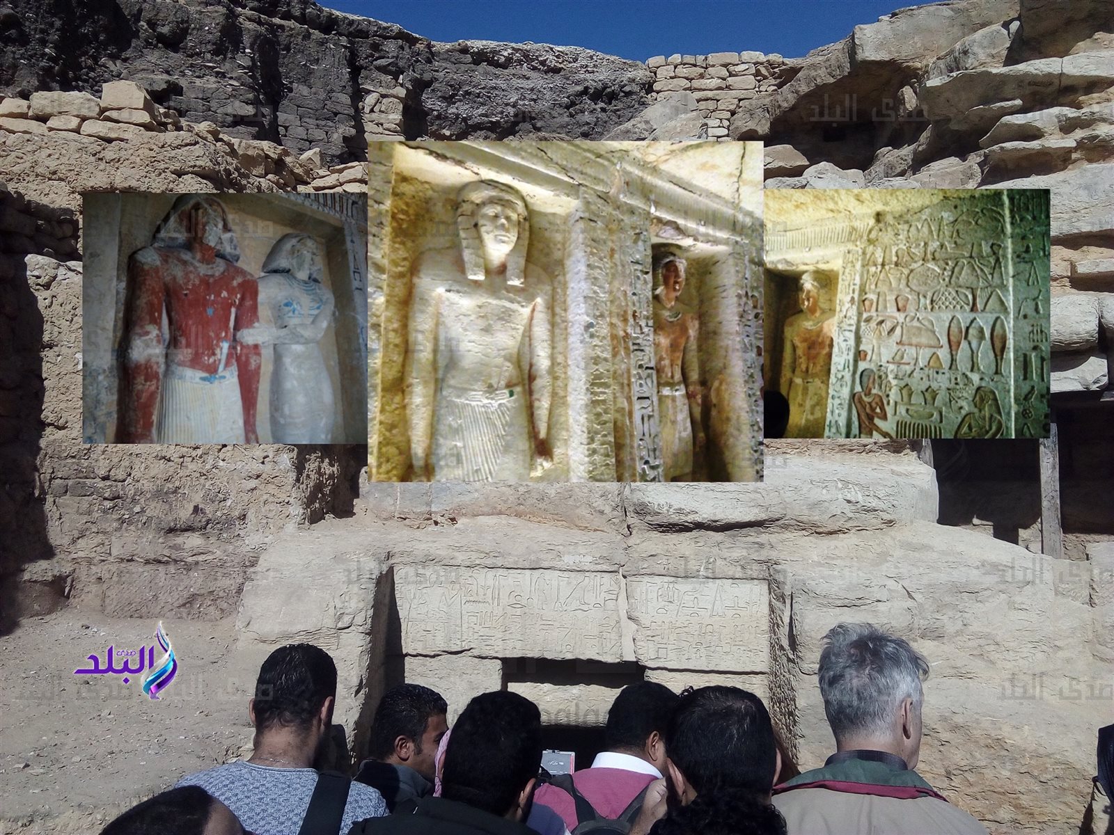وداخل المقبرة وجدنا 18 نيشة تضم 24 تمثالا كبيرا منحوتا فى الصخر وملون تصور صاحب المقبرة وعائلته، أما الجزء السفلى من المقبرة فيضم عدد 26 نيشة صغيرة تحوى علي حوالى 31 تمثالا منحوتا فى الصخر أيضا لشخص أما واقفا أو فى وضع الكاتب يرجح أنها لصاحب المقبرة وتماثيل لأفراد عائلته، بالاضافة إلى العثور على العديد من الأواني الفخارية.