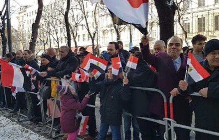 استقبلت الجالية المصرية في فيينا، الرئيس عبد الفتاح السيسي أمام قصر الرئاسة النمساوي، بترديد النشيد الوطني ورفع الأعلام المصرية، رغم برودة الطقس.