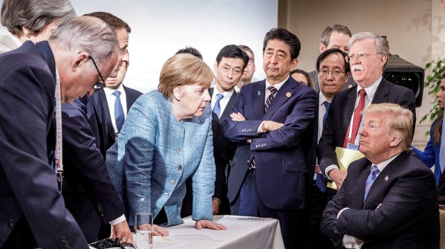 وظهرت ميركل في صورة منحنية علي الطاولة تتحدث إلي ترامب الذي تظهر عليه ملامح التحدي علي هامش قمة أعمال مجموعة السبع في يونيو الماضي.