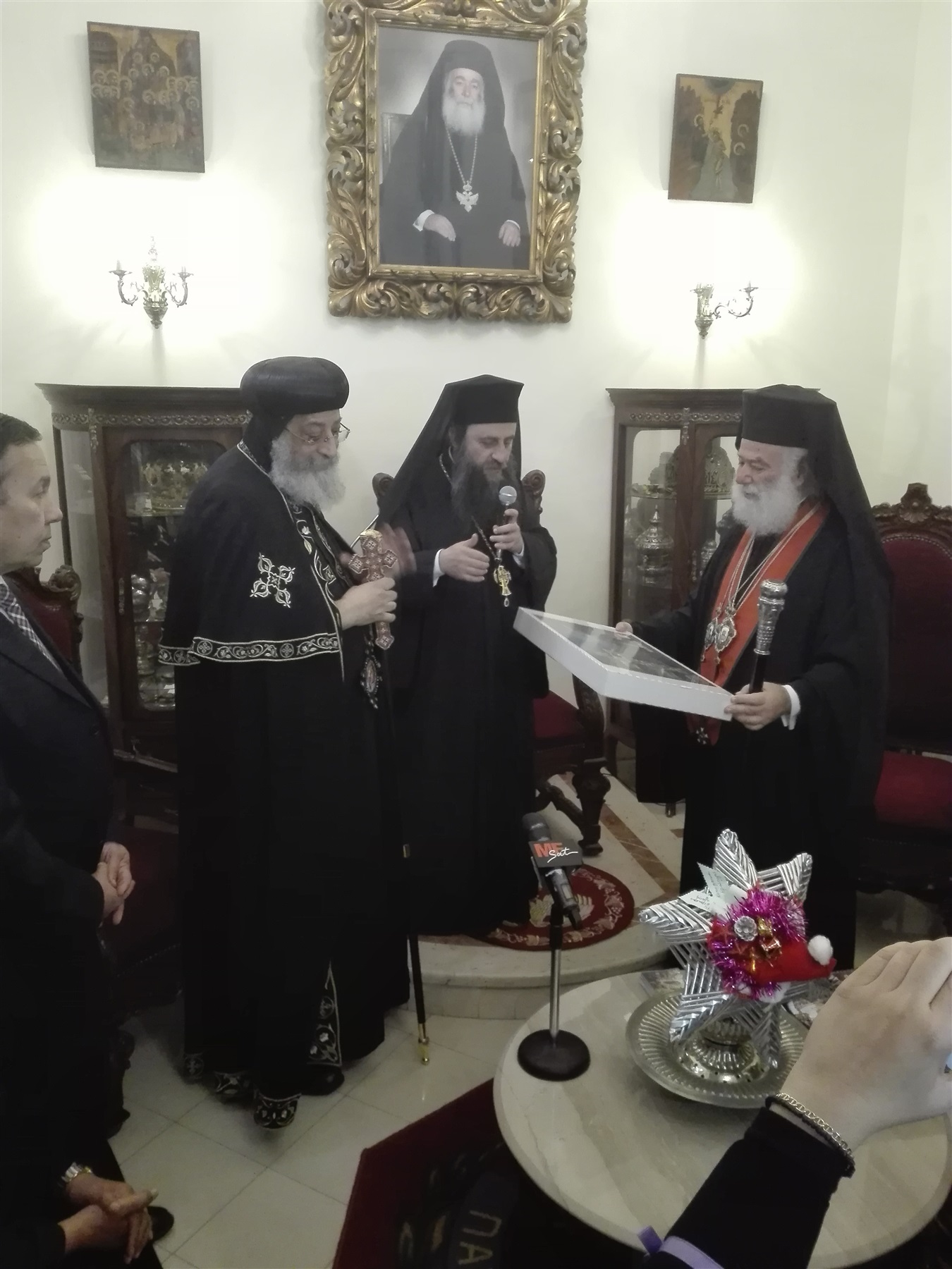 وقدم البابا تواضروس مجموعة من الهدايا التذكارية لبطريرك الروم الأرثوذكس بمناسبة عيد الميلاد المجيد.