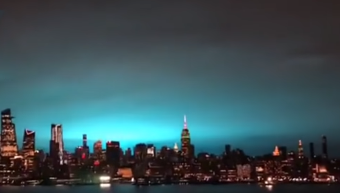 عرضت قناة روسيا اليوم مقطع فيديو يكشف ضوء أزرق يظهر فجأة بسماء نيويورك.