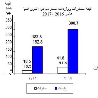 وبلـــغ إجمالـى قيمــة الصــادرات لـدول شـــرق آسيــا 41,8 مليار جنيه عـام 2017 مقابــل 18,5 مليار جنيه عـام 2016 بنسبه زيادة قـدرها 126,0٪.