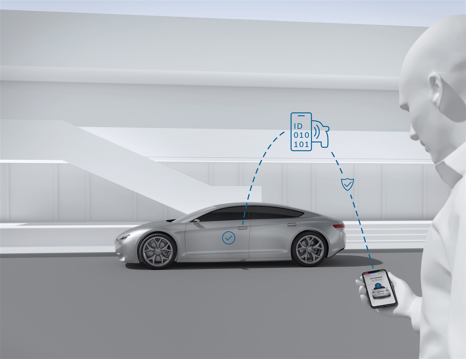تعمل هذه التقنية مع مفتاح افتراضي مخزّن في الهاتف الذكي، وتتعرف المستشعرات المثبتة في السيارة على الهاتف الذكي الخاص بالمالك بشكل آمن، تمامًا مثل نظام بصمة الأصبع، وتفتح السيارة لهم فقط.