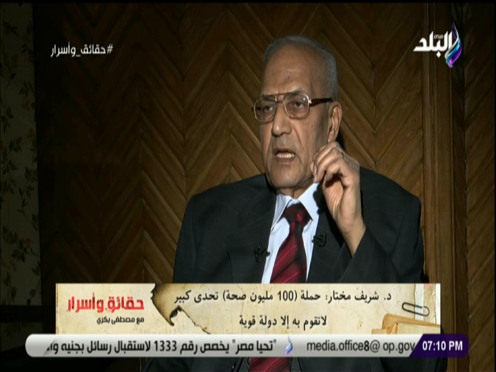 وأوضح مختار خلال لقاء تليفزيوني مع الإعلامي مصطفي بكري في برنامج "حقائق وأسرار" على فضائية صدي البلد، أن مبادرة الرئيس عبد الفتاح السيسي "100 مليون صحة" تقوم بالمسح والكشف على ملايين المصريين، للقضاء علي فيروس سي والأمراض غير السارية من ضغط الدم ومرض السكر.