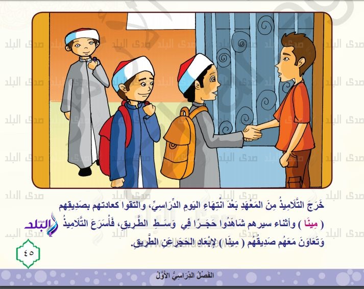 وحرص كتاب التربية الدينية المقرر على المرحلة الابتدائية فى الترم الأول على إظهار طلاب المعاهد الأزهرية وهم يلتقون بصديقهم المسيحى، وهم يحيونه ويتحدثون معه، ففى صفحة «45» بكتاب الصف الأول الابتدائى يقول الكتاب «خرج التلاميذ من المعهد بعد انتهاء اليوم الدراسى والتقوا كعادتهم بصديقهم مينا وأثناء سيرهم فى الطريق وجدوا حجرا فى وسط الطريق فأسرع التلاميذ وتعاون معهم مينا لإبعاد الحجر عن الطريق».