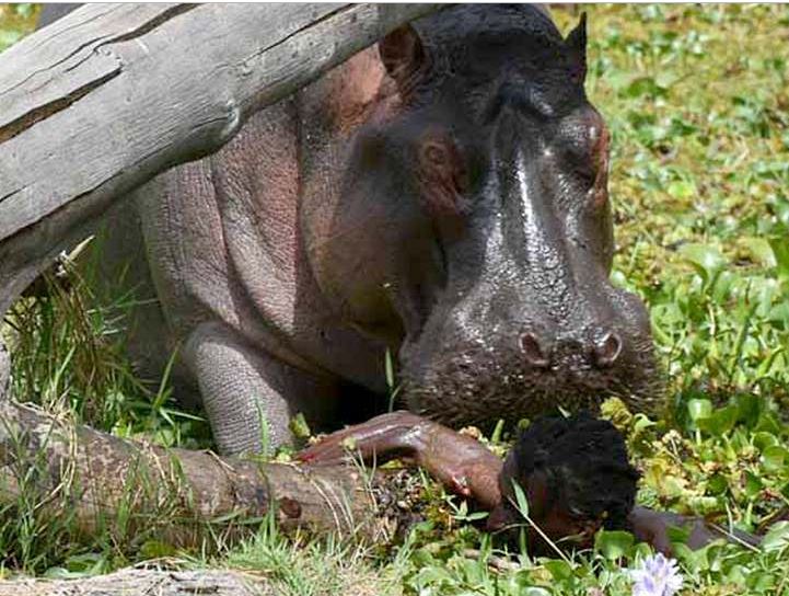 وظل الصياد المسكين محتجزا من قبل فرس النهر، ولم يتمكن من الهرب، حتى أقدم المتفرجون المرعوبون على ضرب فرس النهر بالصفائح المعدنية، لإخافته وإبعاده عن الصياد المسحول بين فكيه وأقدامه.