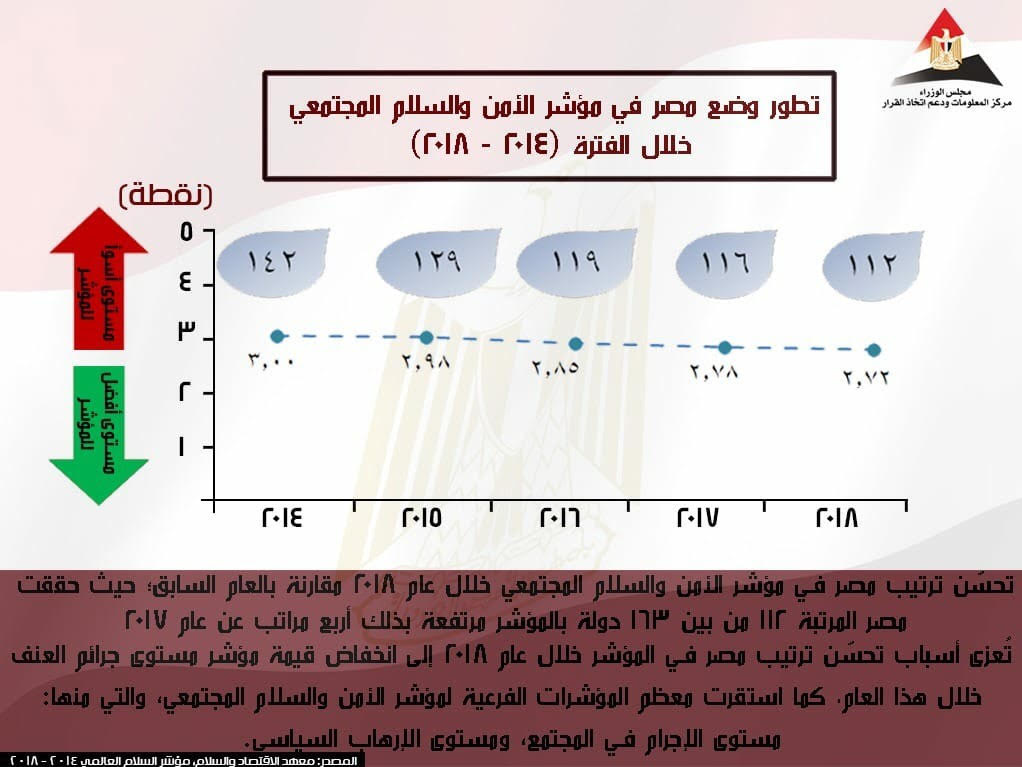 نشر مركز معلومات مجلس الوزراء انفوجراف حول تطور وضع مصر في مؤشر الأمن والسلام المجتمعي خلال الفترة ٢٠١٤-٢٠١٨.
